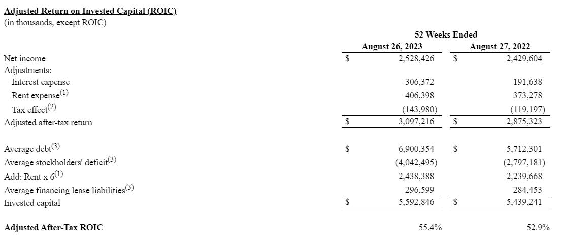 It’s also worth noting one other thing about the AZO model: they generate gobs of cash, return it to shareholders, and open new stores…. but the management is also laser focused on return on invested capital (ROIC). Every earnings release includes the chart below, which shows how outstanding their returns on capital are. And those great returns serve as a huge competitive advantage; having tremendous unit economics means you can open profitable stores where your competitors cannot, and generating insane returns on capital allows you to pursue store growth while also aggressively returns cash to shareholders (which AZO has done; again, they’ve repurchased >100% of their initial shares outstanding over the past ~25 years while more than doubling their store count).