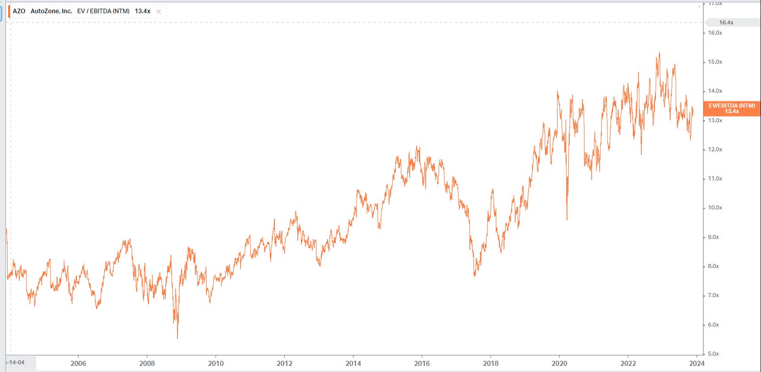 One of the really interesting things about AZO is that it generated those incredible returns without any really multiple expansion or with its multiple getting crazy. Here’s their forward EV / EBITDA over the past twenty years; sure, it goes from ~7x at the start to ~13x by the end, but that’s over 20 years! Multiple expansion barely plays a role in AZO generating those insane returns, and at no point would you ever look at AZO and say “wow, this multiple looks ridiculous.” Instead, AZO was always available at a pretty reasonable price, and they just continued to open new stores, spew off loads of cash, and buyback shares.