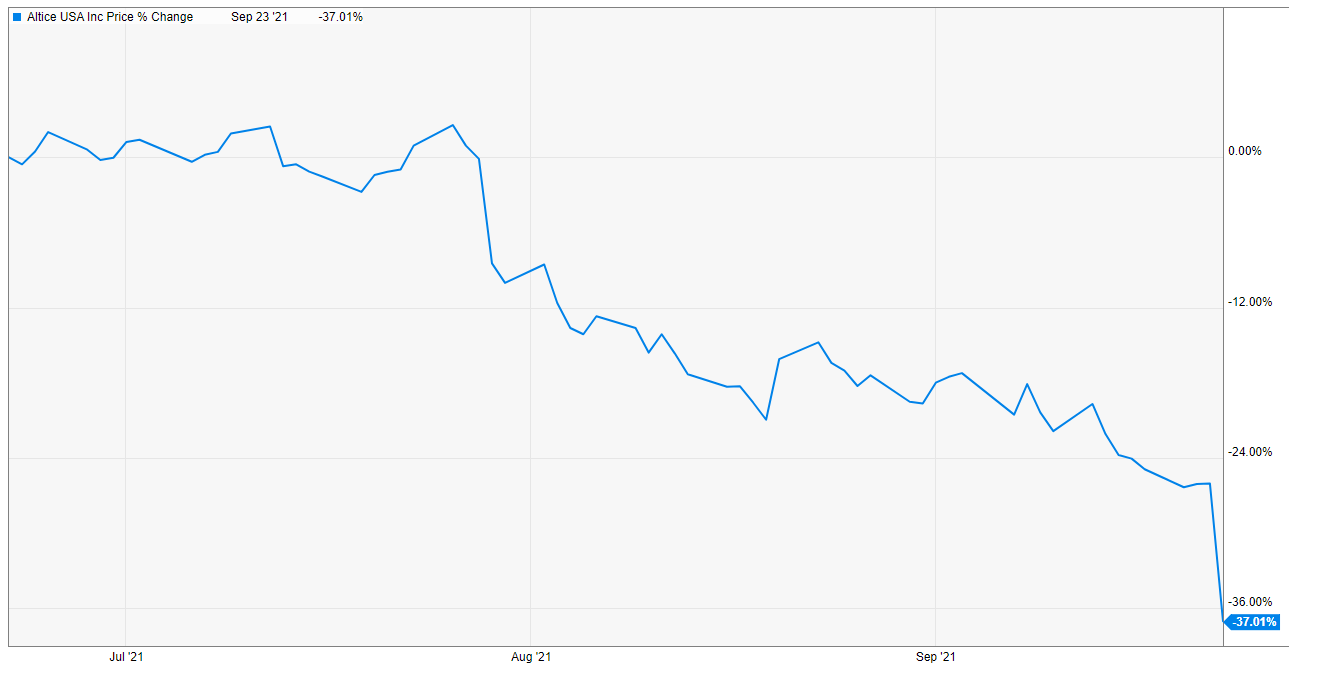 In early July, I called Altice the “best” large cap stock. Since then, the stock has done one thing: go straight down. Today, the stock is gapping down again as the company guided to losing subs in Q3 at the GS conference.