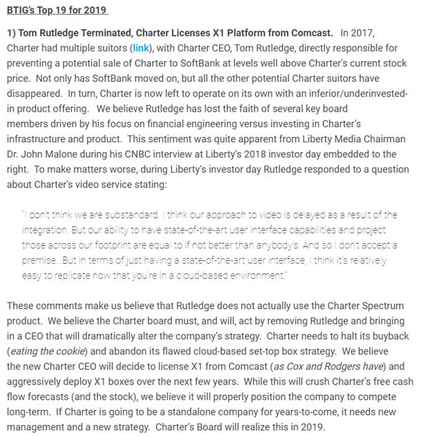 A few weeks after that piece came out, Charter reported FY18 results and guided to 2019 capex coming way down as their integration program finally neared completion. The stock went from $290 to $345 in a day and went pretty much straight up for the rest of the year; it closed the year at just under $500/share. Instead of getting fired, Rutledge delivered on his vision for the combined Charter and made roughly a billion dollars from doing so (and I don’t mean that figuratively. His pay package literally called for him to make almost a billion dollars from executing on the merger and getting Charter’s share price over $500/share).