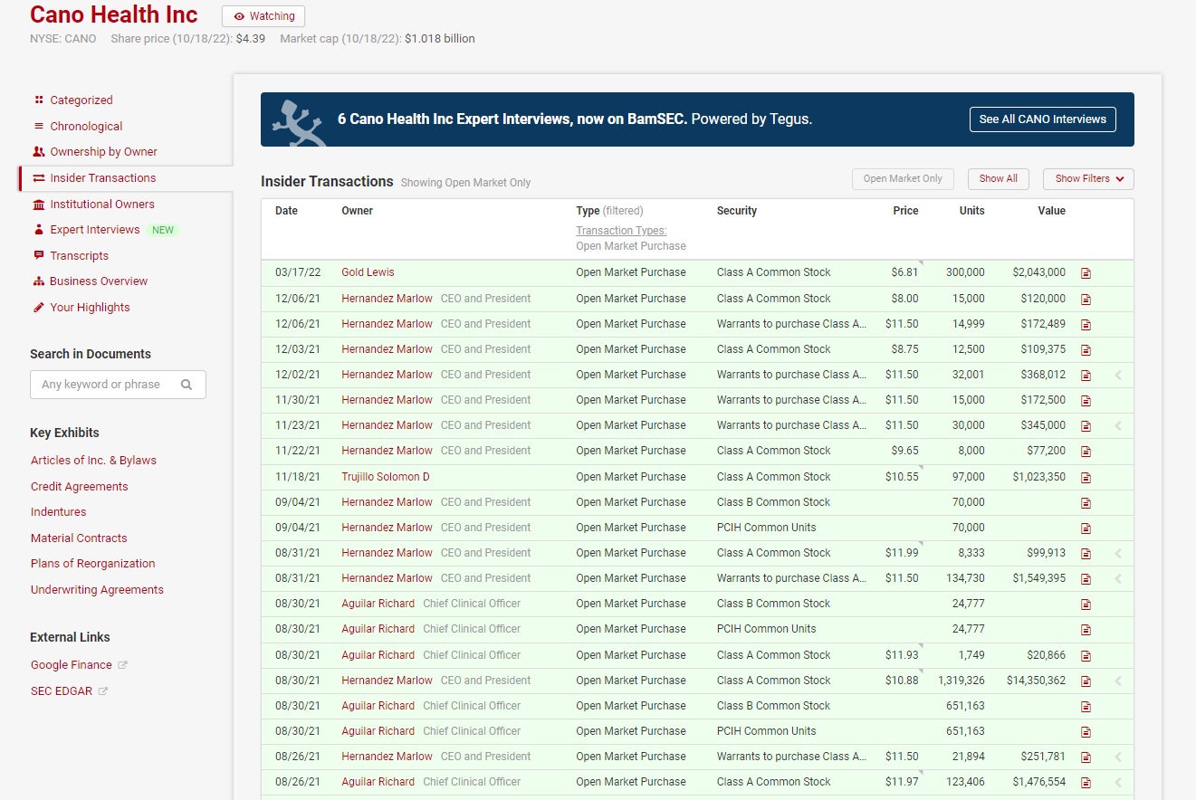 Speaking of cost basis issues, the CEO was an aggressive buyer of stock last year. A lot of those purchases included the CANO warrants. I wonder if the fact he’s underwater on some of those purchases / bought into warrants creates some strange selling dynamics.
