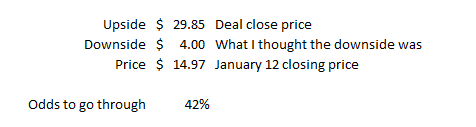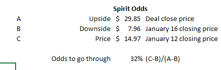 I’ll be honest; SAVE’s downside is actually ended up much higher than my downside. I thought Spirit would trade $3-5/share on a break, so my odds going out on Friday had this priced at ~40% to go through.