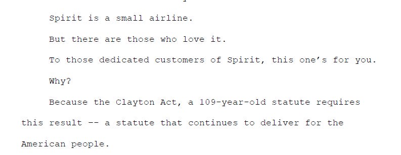 I am, of course, referring to yesterday’s block of the Jetblue-Spirit merger. I was very, very public in my opinion of the deal: I thought the Jetblue case was substantially better than the government’s (and better argued!), and the deal could / should / would be approved. That public stance included no fewer than four podcasts (Two with Lionel Hutz, Two with MDC) as well as countless (premium side) posts.