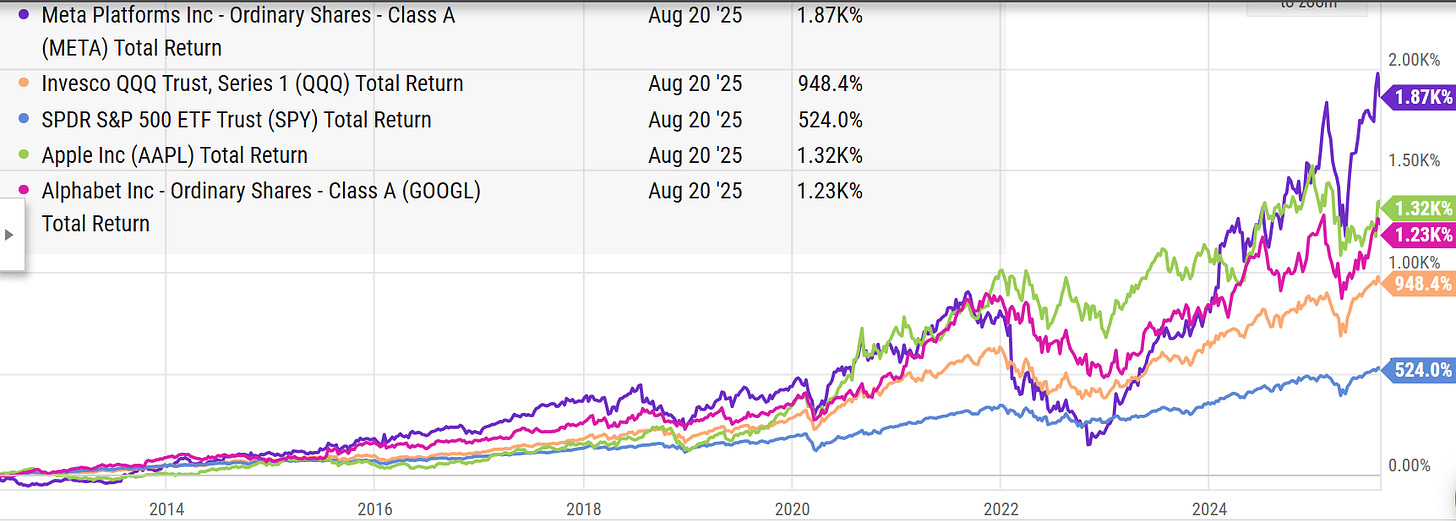 Alongside the “buy mobile phones” insight, you probably could have identified a few businesses that would be really harmed by the spread of the internet; legacy cable media (like CBS) in particular comes to mind2 (though there of course plenty of other losers!). If you had that single insight, you had the making of a great multi-year short as all of the legacy media companies substantially underperformed the index over the next 10+ years.