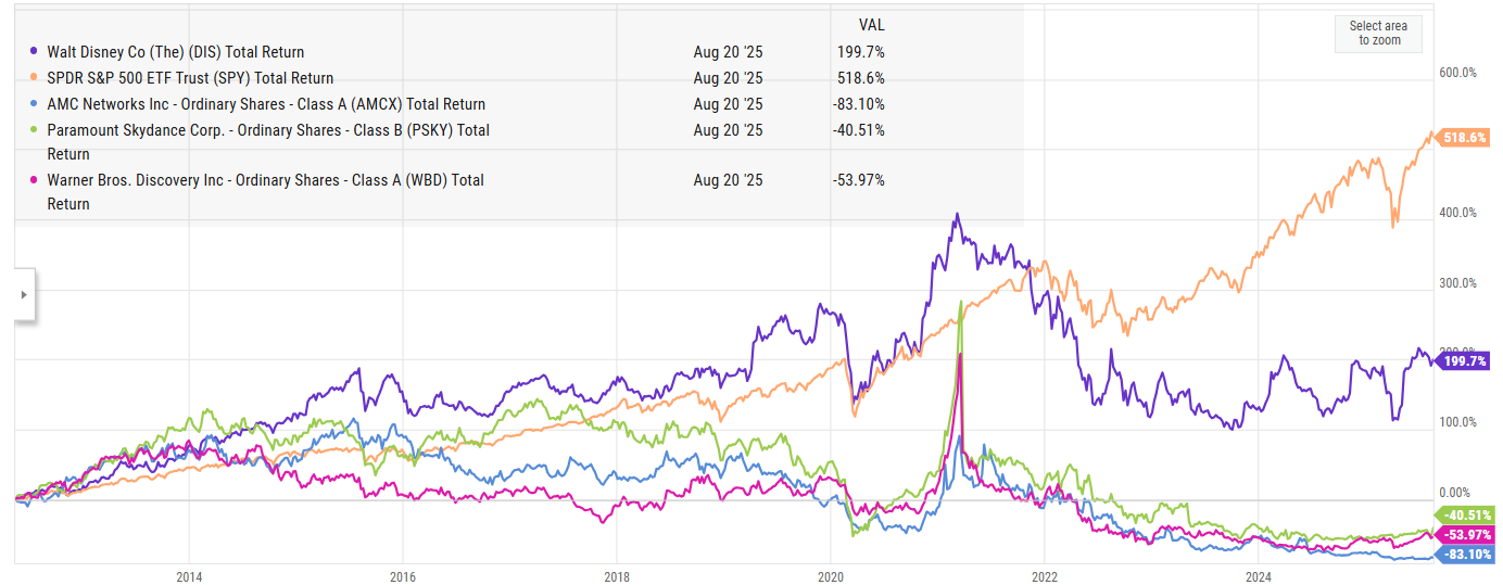 Why? The continued rise of the internet and mobile lowered the distribution cost of video, destroying the best barrier / moat for media companies.