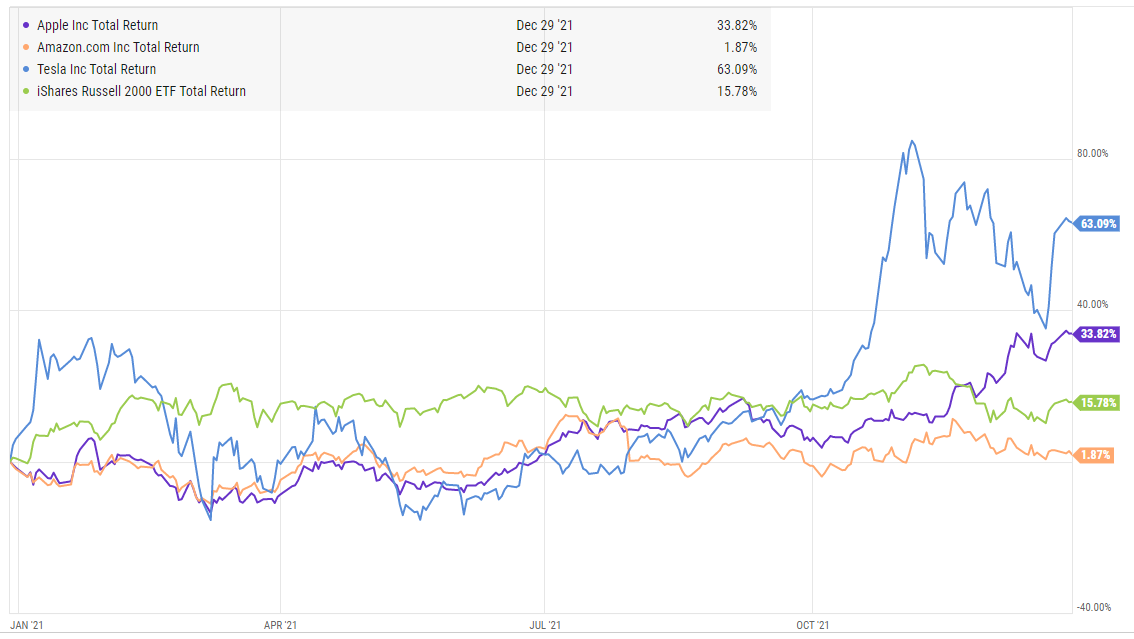 Prediction #4: The law of large numbers finally catches up to Apple, Amazon, and Tesla: Great companies all (well, I have some doubts about Tesla, though bulls like Eric Markowitz lay out a nice case for upside), but the valuation on these is simply too rich and all face some combination of looming increased competition, regulatory scrutiny, and management / cultural changes. Not saying any of these are going down 50% or anything, but all of them substantially underperform the indices in 2022l I know the internet breaks a lot of what we know about returns to scale, but the largest companies in the world simply can’t continue to outperform like this.