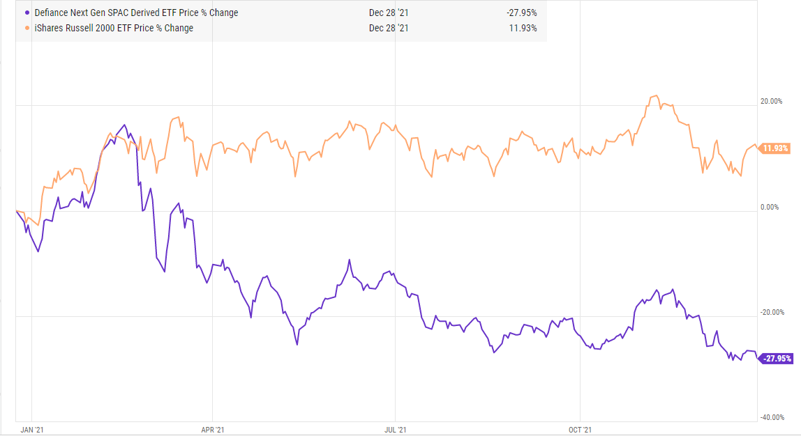 Prediction #5: Waves of pre-deal SPACs fail. One of my resolutions for 2022 is to talk about SPACs less, so I’d better get some SPAC talk out now! Still, I don’t think that resolution is going to be hard: we’re going to see waves of SPACs fail to successfully complete deals and eventually liquidate in 2022. There’s simply too many SPACs searching for deals, and the recent performance of deSPAC’d companies across the board has been so bad that I think all but the most reputable sponsors are going to have trouble getting their deals over the finish line (see chart below; you simply can’t have a SPAC index drop ~30% while the indices go up >10% without having investors question if they want to hold any SPACs thought deals!).
