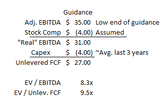 So we know the financials are messy. But the company is really handing us the tools to go about valuing them if you want to do the work. For FY17, FC is guiding to Adjusted EBITDA plus change in deferred revenue of $35-38m. Now that number includes some things I would quibble with, including adding back stock comp of ~$4m, but it’s not major. If we take out $4m of stock comp, we’d get to a “real” EBITDA number of ~$32m. If I average their capex for the past three years, they spend ~$4m/year on capex. Taken out of our ~$32m in EBITDA, the company would do $28m in unlevered FCF per year.