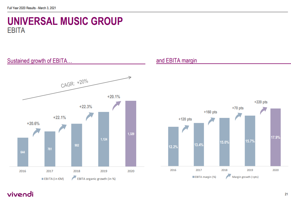Are you a growth investor? Yes, UMG isn’t a hyper-growth Stripe type business… but I think a lot of investors are going to be very surprised by how quickly this business is growing. Streaming revenues now make up >50% of UMG’s revenues and have grown ~27% over the past five years, and EBITA has grown at a 20%+ clip over the same time frame. In addition, in some ways UMG is a minor tax on the continued rise of digital entertainment; music is a bedrock of tons of online experiences, and UMG gets a piece every time someone puts one of their songs into a game / social interaction / movie (that’s right, UMG gets a piece every time someone uploads a TikTok video with their music in it or you hear one of their songs during a Peloton ride!).