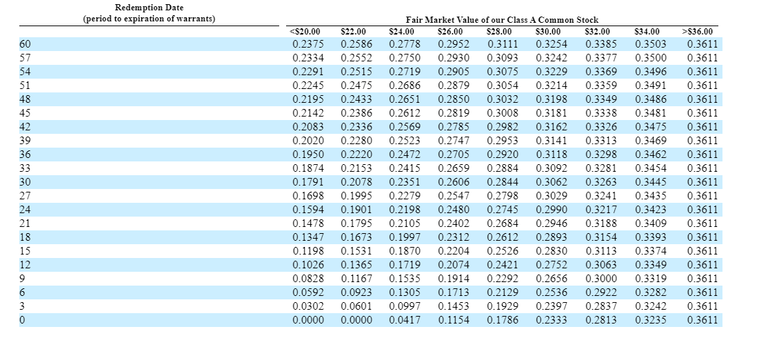 How many shares of PSTH will you receive if you exchange a warrant? The answer depends on where PSTH is trading right before the exchange takes place. You can find a full description on ~p. 166 of PSTH’s prospectus, but the basics are PSTH offers warrant holders an amount of shares based on the VWAP of their stock in the 10 days leading up to the exchange. So, for example, right now PSTH is trading for ~$22/share. When the exchange goes through, there will be ~60 months remaining until the warrants are redeemable, so right now PSTH would offer warrant holders .2586 shares of PSTH for each share of common stock they have. You can do a spot check of that based on current prices; 0.2586 shares times PSTH’s $22/share price is ~$5.69/warrant, which is right around where the warrants are currently trading.
