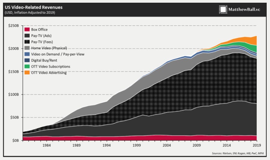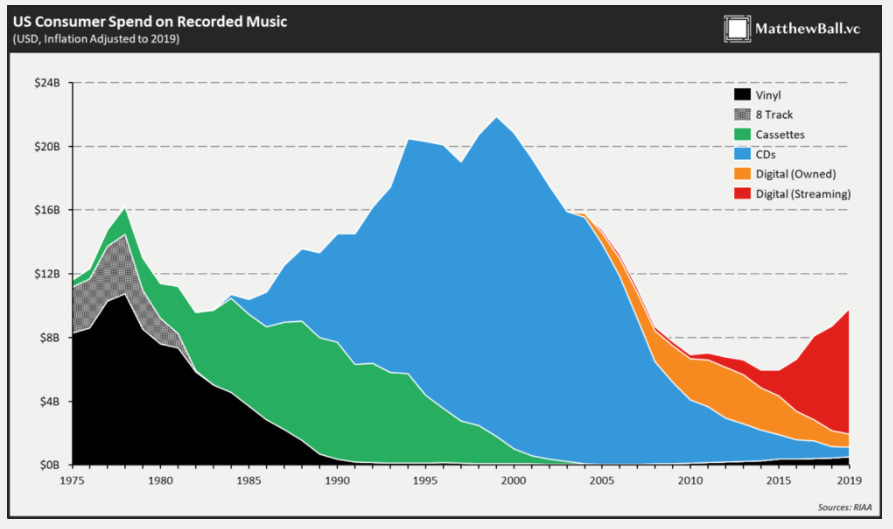Despite a huge growth in streaming revenues over the past few years, U.S. spend on music is way, way down from where it was in the 90/early 2000s. Compare that to video, which has continued to grow relatively relentlessly despite the rise of streaming and everything. I’m not saying music will ever get back to its peak, but that it’s so far below it’s peak despite the fact music is probably more ubiquitous / listened to today than it was in the 90s (thanks to all of us having all the world’s music on in our pockets at all times!), I would be pretty surprised if there weren’t tons of continued upside to music’s monetization.