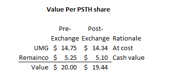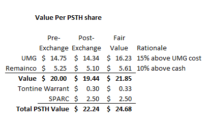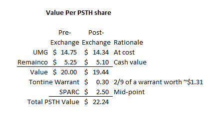 Alright, let’s talk about exactly what each share of PSTH will become after the current deal goes through. If you own one share of PSTH and do no redeem, your share will become four things: 1 share of PSTH remainco (with ~$5.25/share in cash), some shares in UMG (which cost ~$14.75/share), the tontine warrants (which will give you a call option on PSTH remainco), and a SPARC (basically, a five year SPAC right).