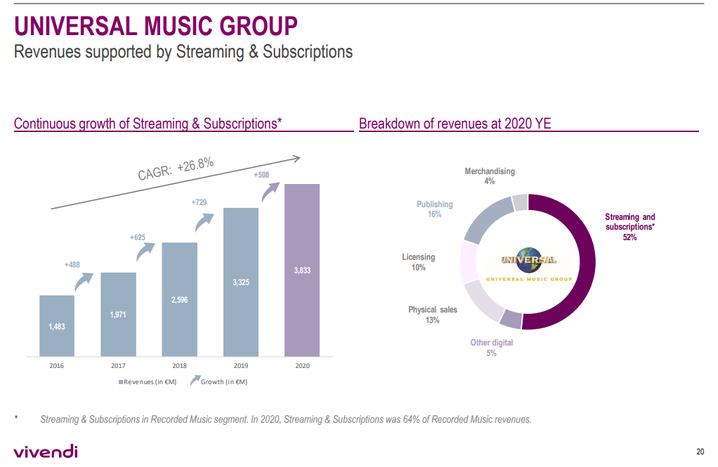 And, if you break down the story even further, I think there’s even more to like. I discussed UMG’s relative valuation versus WMG last week, so I won’t dive into it here (to simplify: PSTH is buying UMG at ~the same multiple WMG trades at despite the fact UMG is a better business and WMG should get a controlled company discount). But I think growth investors are going to love UMG’s exposure to streaming, and I think value investors are going to love the visibility and consistency of UMG’s catalogue.