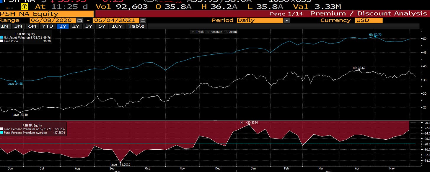 As I write this, PSH is trading for a ~20% discount to NAV. Now, it’s a closed end fund, so the capital is locked in. Most closed end funds trade at a discount to NAV given the capital is locked up so their fees are relatively perpetual. PSH pays a relatively full / hedge fund expense structure, so you could make an argument PSH should trade for a discount.