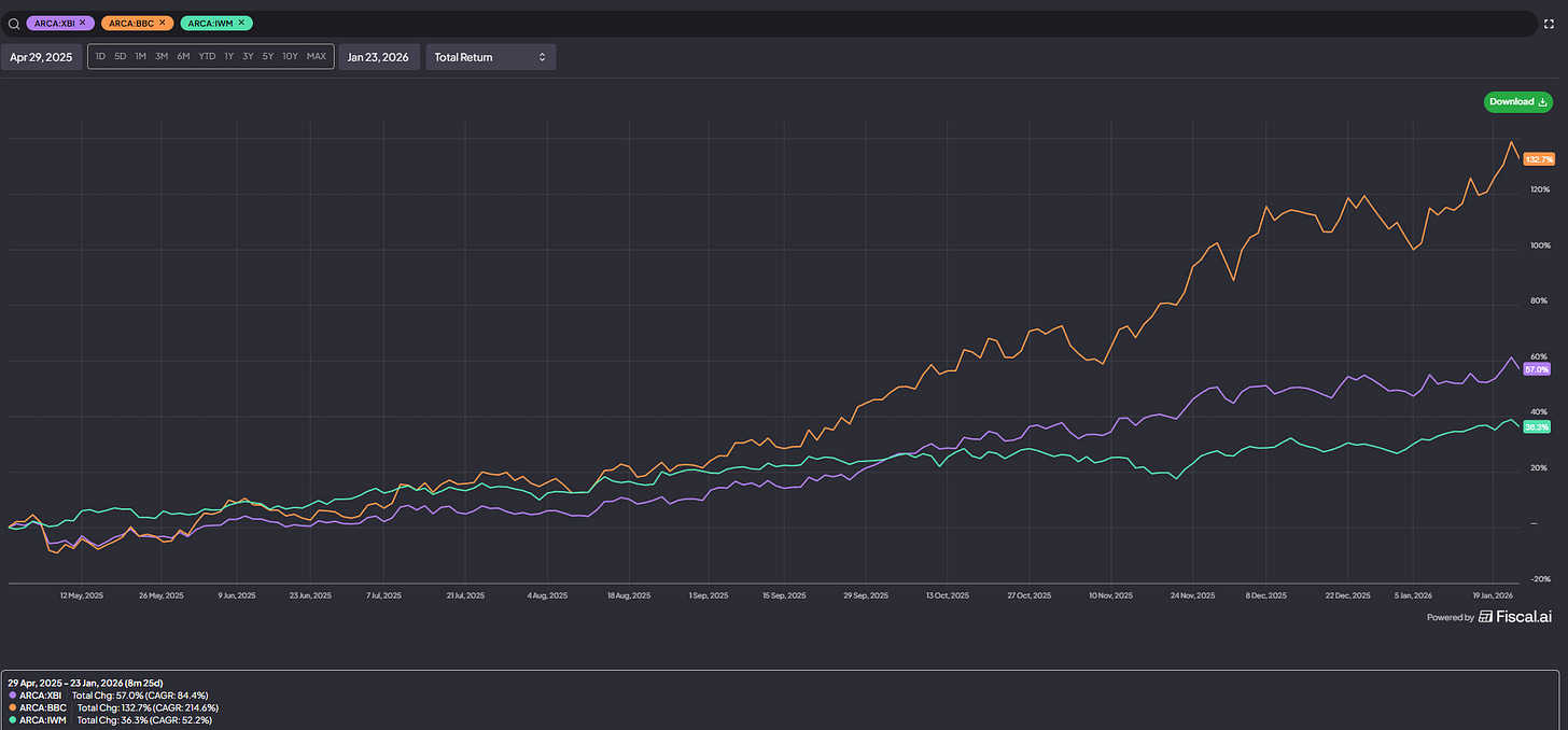 That “busted biotech” focus has played out well over the past year; some biotechs returned capital, some announced blockbuster data out of nowhere, and some got taken out. It didn’t hurt that the whole sector rose from the ashes like a Phoenix: