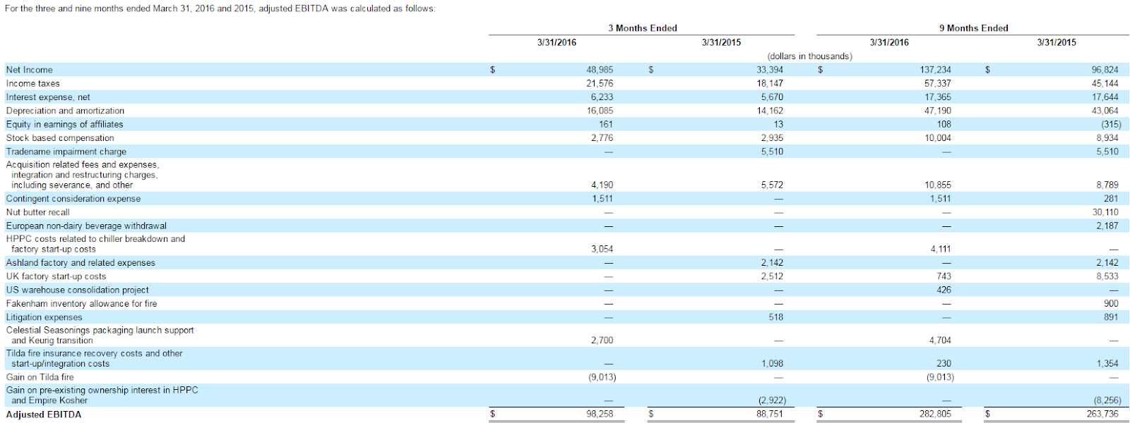 Cash Flow is real: As discussed in our risks section, HAIN definitely makes liberal use of adjustments for Adjusted EBITDA; I’ve pasted their most recent adjusted EBITDA reconciliation at the bottom of this paragraph to give a view. While the adjustments are large and I wouldn’t give full credit for a few, the bottom line is that they do have a real business generating real cash flow. For example, in FY15 Adjusted EBITDA was $375m. CFO was $185, and they paid $23m in cash interest and $47m in cash taxes. That’s a conversion rate of just under 70% (($185 + $23 + $47)/ $375); certainly not perfect, but it at least shows the business is generating cash approaching the levels they say they’re doing. And FY15 had some truly onetime expenses; this “EBITDA to actual cash” number approaches 80% if you go back to FY14.