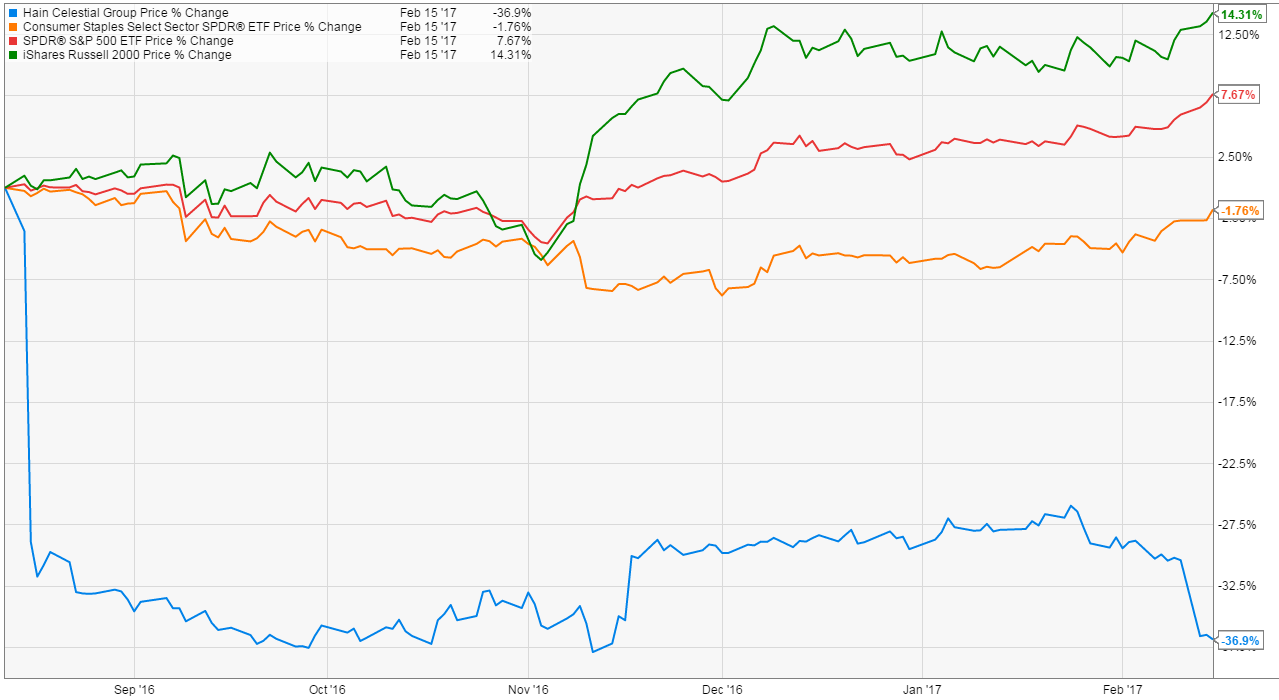 Hain started showing weakness as early as 2015, when increasing competition from both larger players and private labels like Whole Food’s 365 brands started to effect growth. The big problems, however, started last August, when HAIN needed to cancel their earnings release to look into the revenue recognition related to concessions given to distributors as well as look into their internal controls; in connection with that delay, they also announced they wouldn’t be hitting their full year guidance. Since then, the company has put out shockingly little information. They’ve gotten a few bank waivers for their credit facilities, and they announced their independent audit committee review found no intentional wrongdoings, but the company has been relatively radio silent on the process until last Friday afternoon (Feb. 10), when they filed this NT 10-Q after market close that announced an ongoing SEC investigation into the accounting issues as well as expanding their review from just distributor concessions to “perform an analysis of previously-issued financial information in order to identify and assess any potential errors.” HAIN’s share price has been decimated by the lingering issues, as it’s dropped by ~37% in a rather strong bull market.