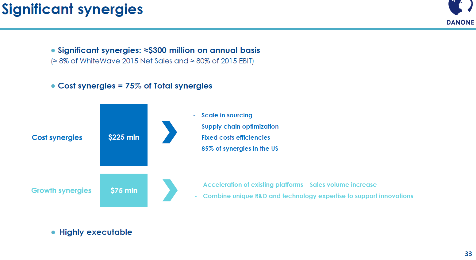 WhiteWave is probably Hain’s best peer, and its acquisition is instructive for what a big food player would see in acquiring Hain. WhiteWave is in the process of being acquired by Danone for ~23.4x LTM EBITDA / ~21x 2016E EBITDA. Danone made clear the acquisition was about improving their growth outlook, but they also saw significant synergies in the deal. Danone’s synergy forecast called for synergies at 8% of 2015 sales levels (and 80% of WWAV’s standalone EBIT!); the synergies were ~75% cost related and 25% revenue / growth synergies. Despite the high multiple and high level of squishier / more difficult to achieve sales synergies, Danone investors loved the move and sent the stock up ~3% on the deal.