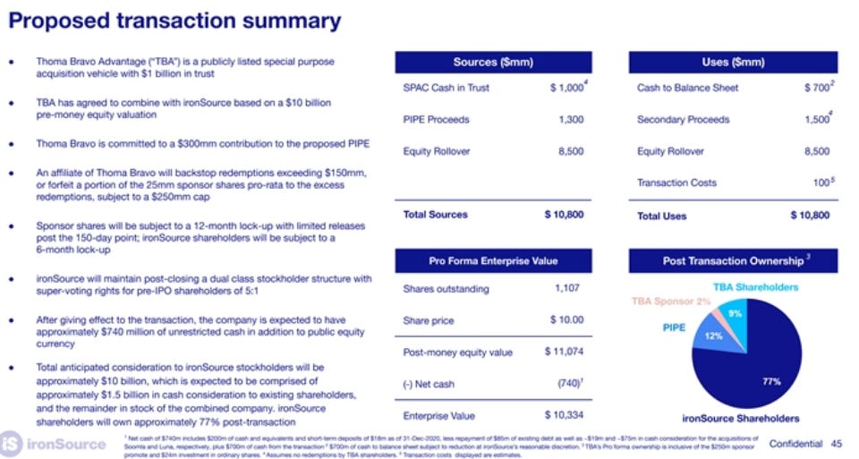 The solution is to have outside capital willing to backstop the deal or cover redemptions. A good example of this is the recent TBA / IronSource tie-up. The SPAC has $1B in trust, and they struck a deal that had $1.3B in PIPE. On top of that, Thoma Bravo, the sponsor, agreed to purchase another $250m of shares to cover redemptions if investors redeemed more than $150m. That’s a powerful combo: it narrows the range of cash that IronSource would receive and guaranteed a minimum cash level for IronSource. It also was a powerful signal from the sponsor: they invested $300m into the PIPE and agreed to cover another $250m of redemption. Money talks, and in this case TBA was signaling to shareholders that they believed in the IronSource deal and were willing to put their money where their mouth was / alongside SPAC shareholders.