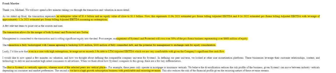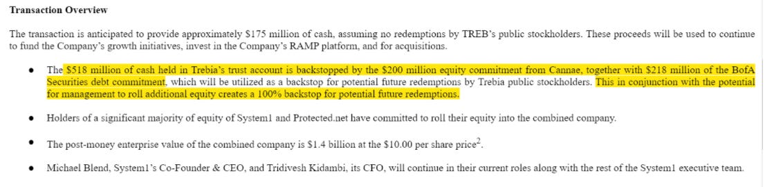 Again, TREB has ~$518m in trust and had a forward purchase agreement from CNNE for another $75m. As part of the System1 deal, TREB and CNNE are cancelling the forward purchase agreement. Instead, CNNE will backstop the first $200m of redemptions. TREB has also lined up a $218m debt commitment from BoA to cover any redemptions above the $200m CNNE backstop level. That covers $418m of the $518m CNNE has in trust. On top of those backstops, System1’s management team has agreed to roll $100m of equity in place of cashing out if redemptions exceed $418m. In other words, TREB has managed to structure a deal that delivers a baseline level of cash to System1 even if every minority TREB shareholder redeems. (You can quibble with this because once redemptions top $200m, System1’s debt goes up, and I’m not sure management’s promised equity roll really changes the deal dynamics. Still, it’s a structure that guarantees access to hundreds of million in cash no matter what shareholders do) (clip below from the merger announcement)