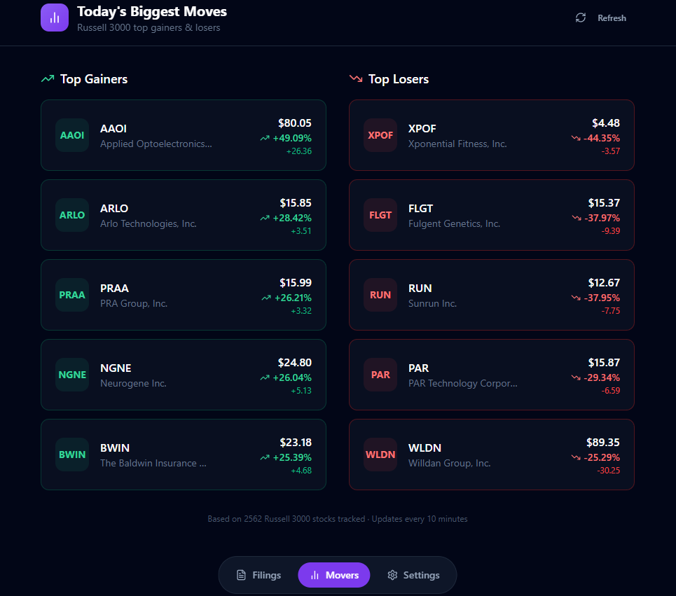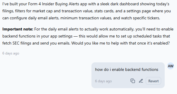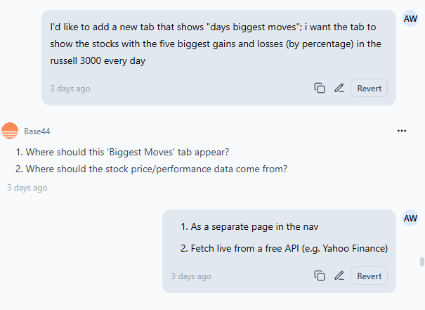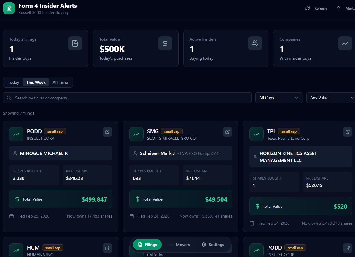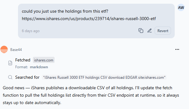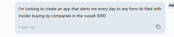 From there, it was pretty easy. Over the course of a week, I’d look at the app and see something I wanted added or tweaked. For example, I wanted it to track form 4s in the Russell 3000, so I just told it to go to the Russell 3000 ETF and track those tickers: