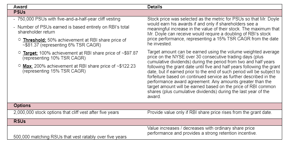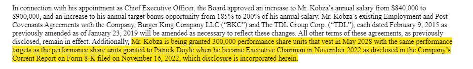 So QSR has an industry legend with a history of successfully creating value in franchising in charge, and he should be reasonably incentivized to create value: he was given an equity heavy package when he joined QSR; the headliner here is probably the PSU grant of 750k shares if he can get the stock to $97.87/share by November 2027, which balloons to 1.5m if the stock hits $122.23/share. That’s a solid ~$200m payoff for performance (on top of another 500k RSUs and 2m in options that he was given when he joined). The image below lays out Doyle’s incentives and payments very nicely (it’s from QSR’s proxy), but here’s the original 8-K if you want all the details.