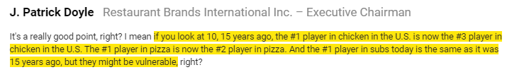 Anyway, I was reading Pershing Square’s annual letter this week, and something struck me: I’m kind of surprised I haven’t heard anyone talking about Restaurant Brands (QSR). It’s a ~13% position for PSH, it fits literally every bucket for getting a ”quality multiple” that I mentioned in my quality post, it trades for a reasonable valuation, and it’s run by highly incentivized management that have created restaurant rocket ships before. That’s a pretty crazy combo…. yet I don’t think I’ve had one person mention the stock as an opportunity. And I don’t just mean no one mentioned it as an opportunity in response to my post; I mean I haven’t seen or heard of anyone (outside of Ackman) talking about QSR as a long.