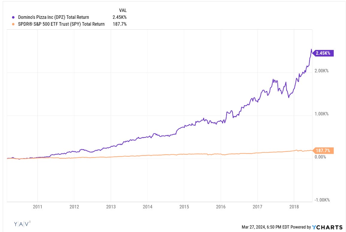 Then consider the management team. QSR’s executive chairman is Patrick Doyle; you may remember him from his insanely successful run as the CEO of Domino’s (where he famously admitted the pizza tasted like cardboard). He was the CEO of DPZ from early 2010 until the middle of 2018; the stock did alright under his leadership….