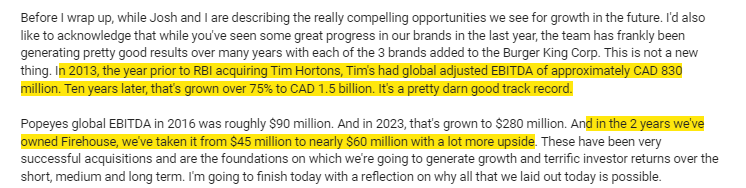 So, no, I don’t think QSR offers the most alpha on the market…. but I’ve been wrong before (too many times to count!), and the set up here is incredible: put it all together, and you’ve got a quality company backed by a famous investor in an industry where he’s “never lost money” and run by a highly incentivized management team with a history of creating enormous value who has literally just laid out their path to double digit annualized returns (or better)!