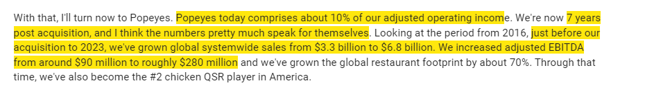 There’s also the possibility of accretive M&A. I’m generally skeptical of M&A creating value, but there are multiple verticals QSR isn’t in and given their scale and franchisee relationships there’s a decent chance there’s an M&A transaction or two in the next five years that creates some value; just look at the returns from the Popeyes acquisition: