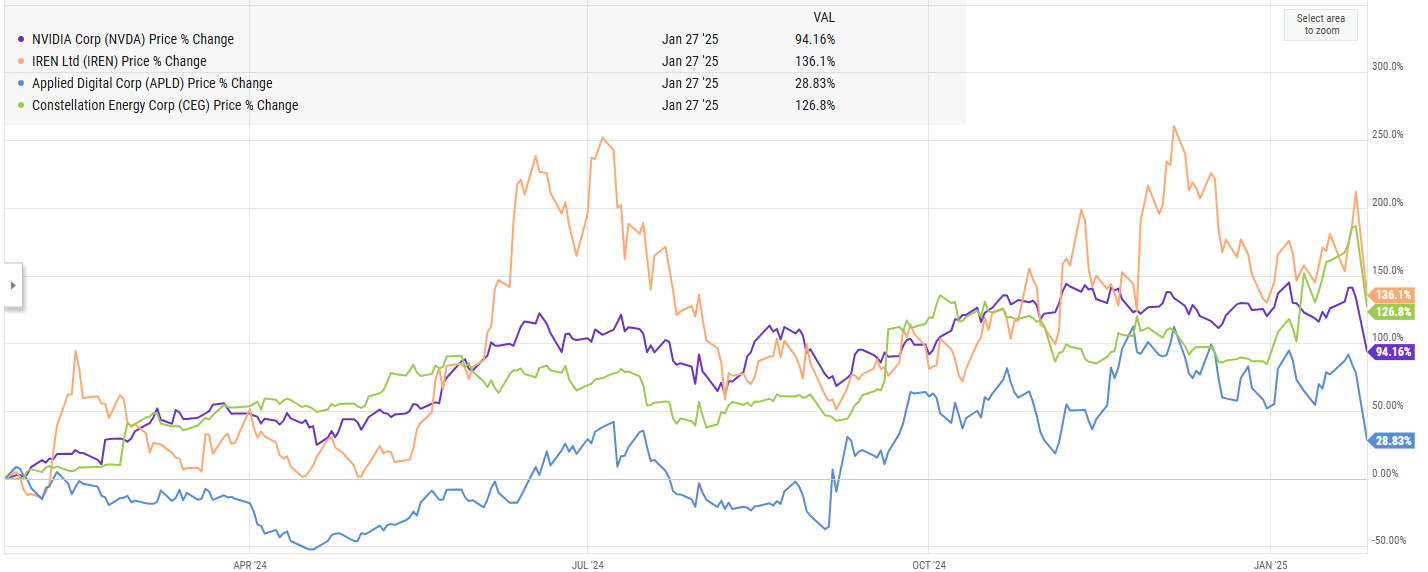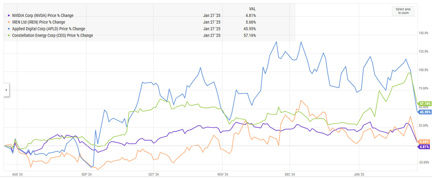 Yesterday, basically anything that touched AI got smoked on the heels of the DeepSeek news. NVDA was down ~17% (the largest one day market cap drop in history!), power providers like CEG were down 20% (remember: a huge piece of the recent power boom has been driven by AI demand, so anything that hits AI is awful for them), and companies that had huge data centers that had the potential to convert to AI were smashed as well (for example, APLD and IREN, two bitcoin miners hoping to convert to AI data centers, were each down ~25%).