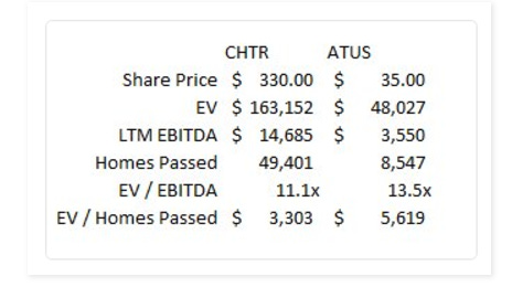 Some of Ventures’ debt effectively functions as a call option sold on some of their Charter shares that is struck at $341; I have not adjusted for that in the NAV above but it results in a pretty small swing until Charter starts to hit $400 or $500/share; at that point, Ventures’ NAV is up so much that the adjustment really doesn’t make a difference for investors at today’s prices. Worth keeping in mind if you are looking to hedge a piece of this by shorting CHTR out though.