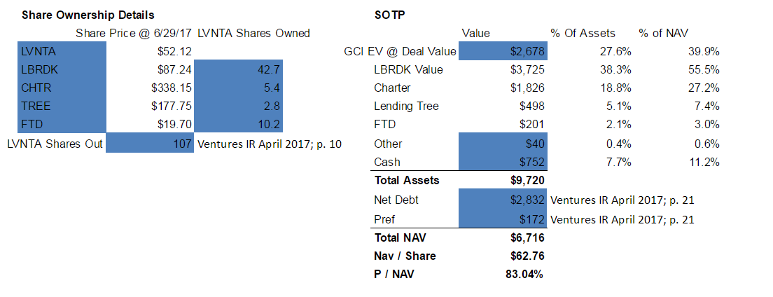 With ~107m shares outstanding post GCI close and adjusting for the share price movement of their underlying stocks (mainly TREE appreciating to ~$178/share and CHTR to ~$340/share), Ventures today would have a NAV/share of ~$63 (assuming deal close and that GCI is worth their $2.7B valuation). With shares today trading just around $52.50, investors are looking at ~20% upside for LVNTA to hit its NAV. Below you can find an updated NAV table for share prices as of 6/29/17.