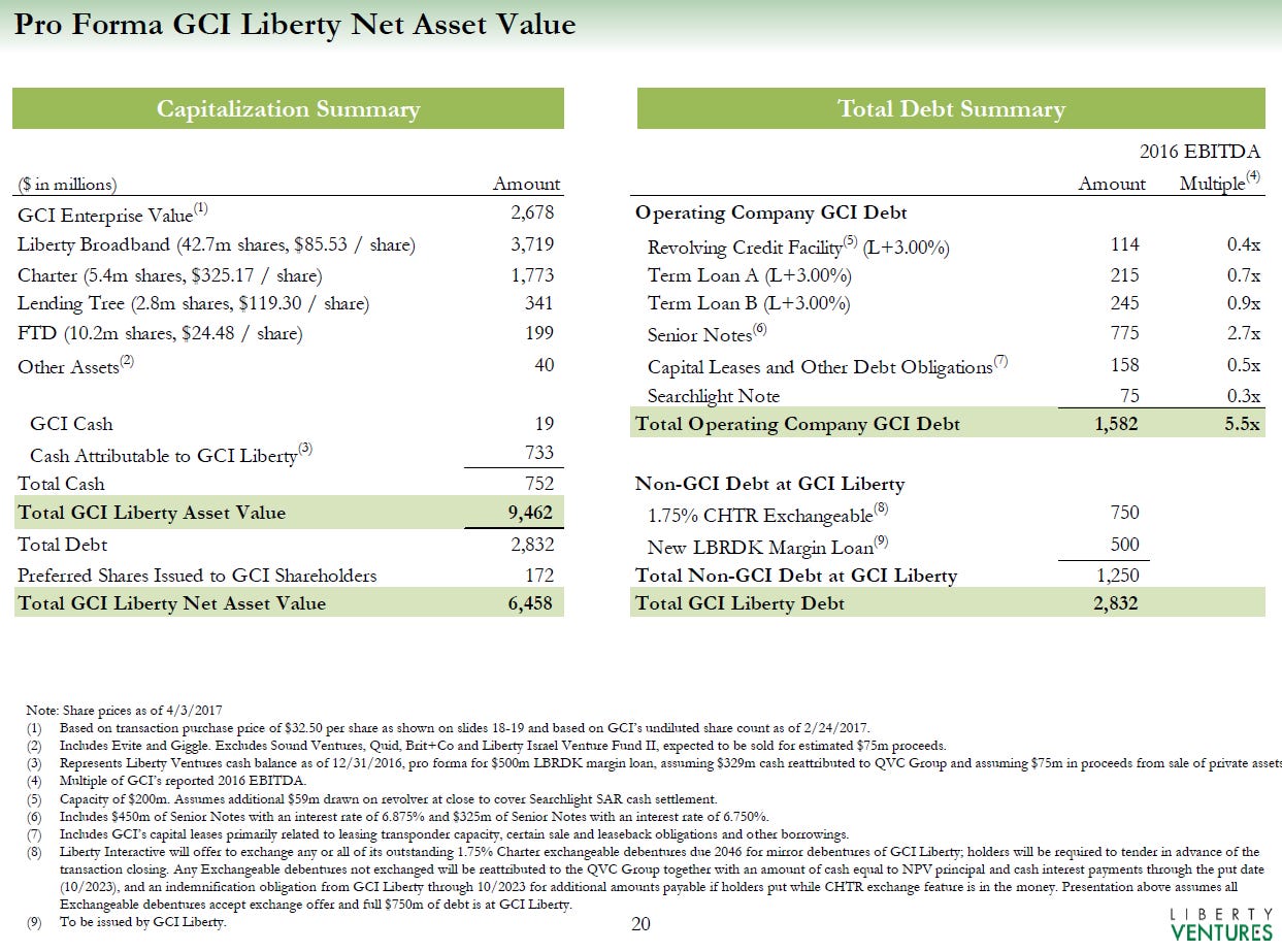 Post GCI deal close, Ventures will consist of 4 main assets: 100% ownership of GCI (the operating business), 42.7m shares of Liberty Broadband (ticker: LBRDK), 5.4m shares of Charter (ticker: CHTR), and ~$500m worth of two other stocks (2.8m shares of Lending Tree; 10.2m shares of FTD). Their investor presentation does a nice job of breaking out all of their different assets and liabilities.