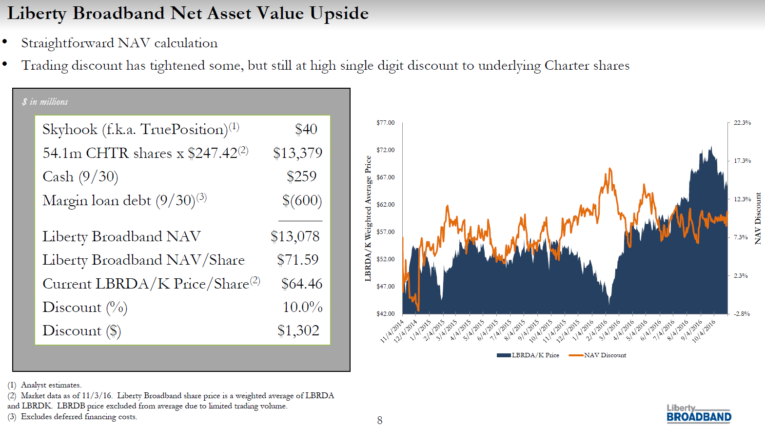 The NAV discount is actually slightly bigger than advertised due to a discount to NAV at Liberty Broadband and a bargain purchase of GCI.