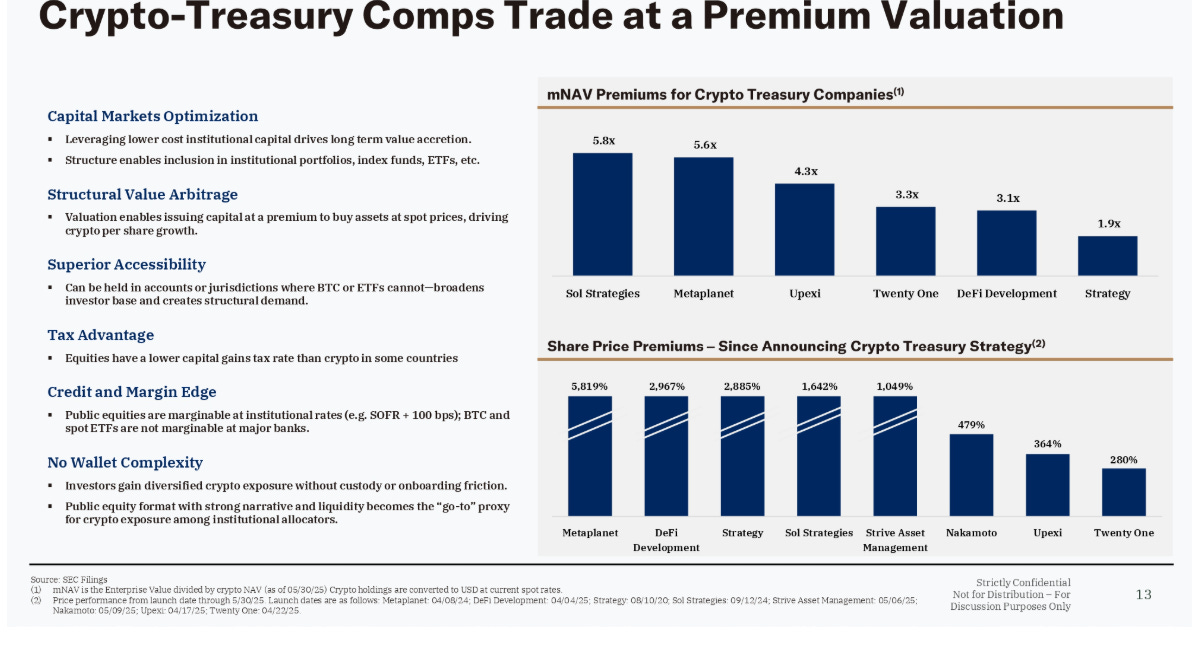 Anyway, right now the markets are euphoric, and crypto-treasury companies in particular are all the rage. If you’ve been living under a rock, a crypto-treasury company is a company that buys bitcoin (or some other crypto) and HODLs it on their balance sheet. For some reason, the market has decided these companies should trade for a huge premium to NAV. This slide from MBAV’s1 deSPAC presentation illustrates it well: