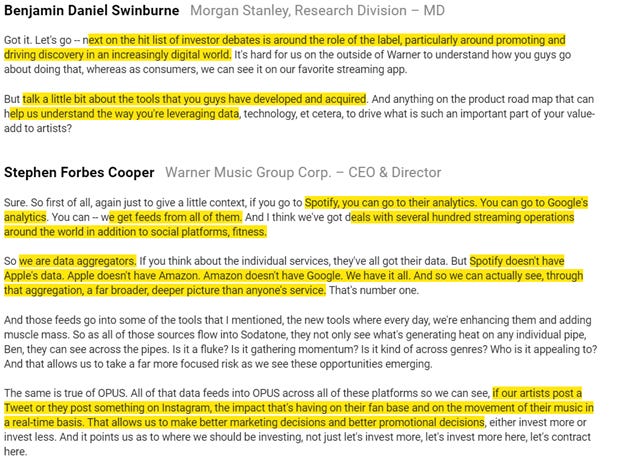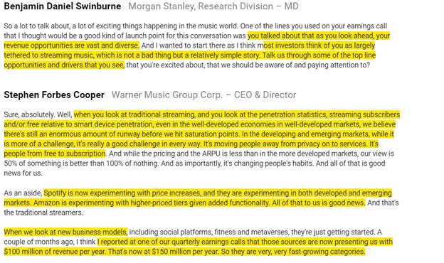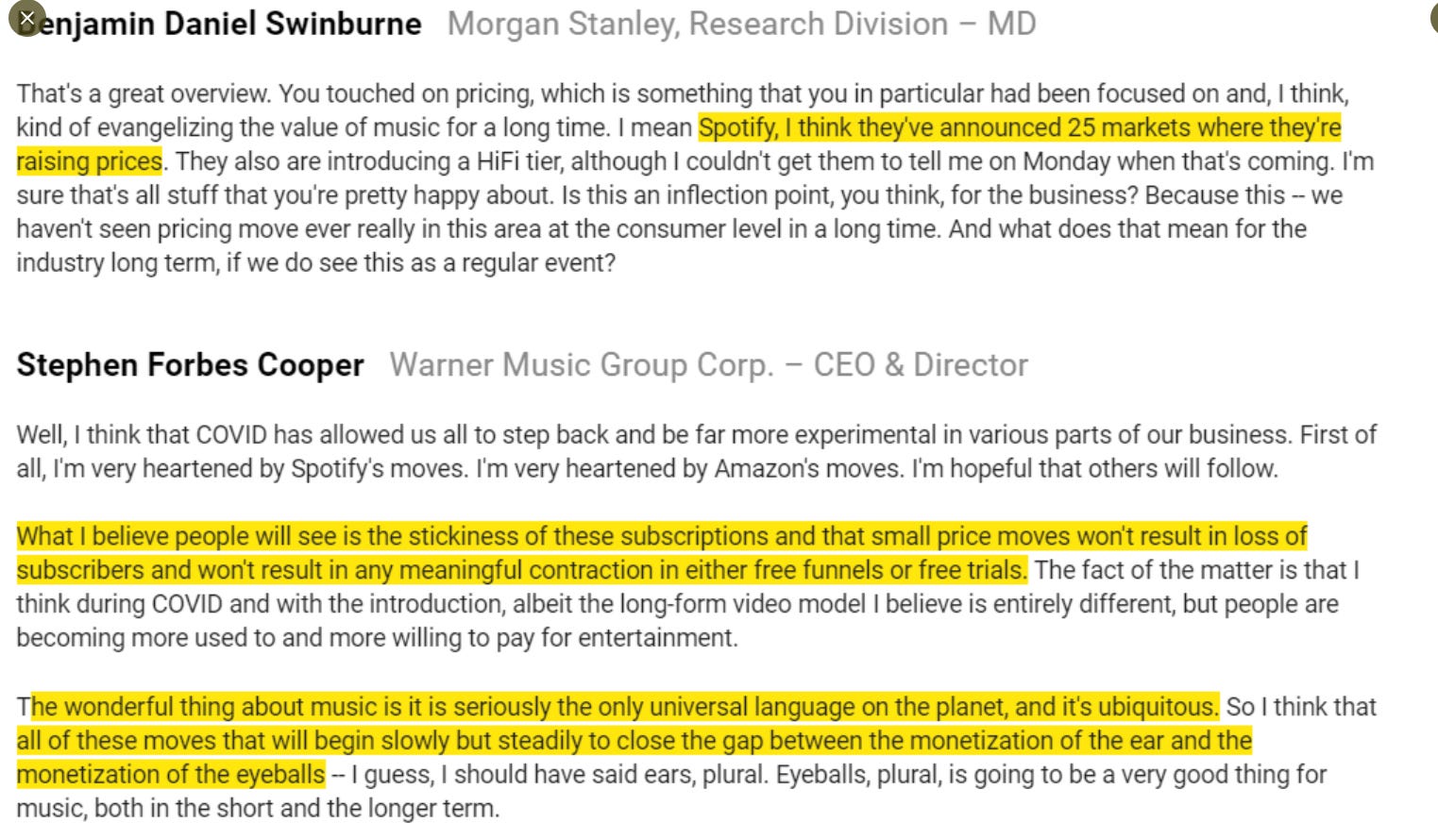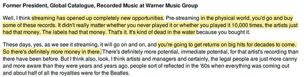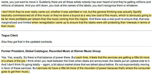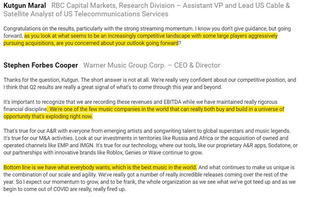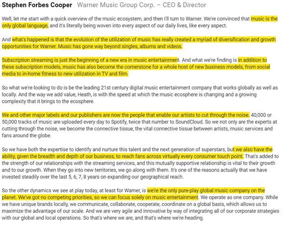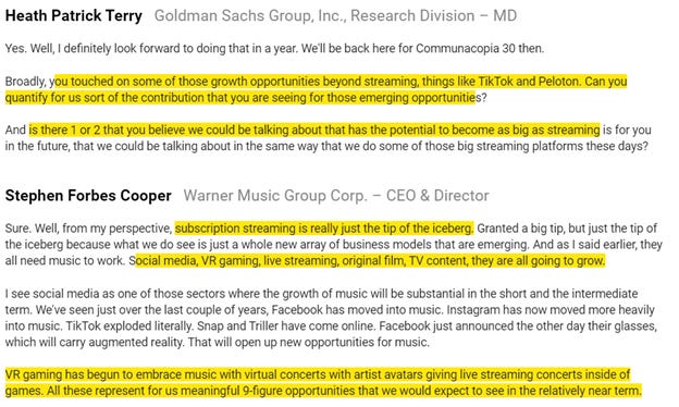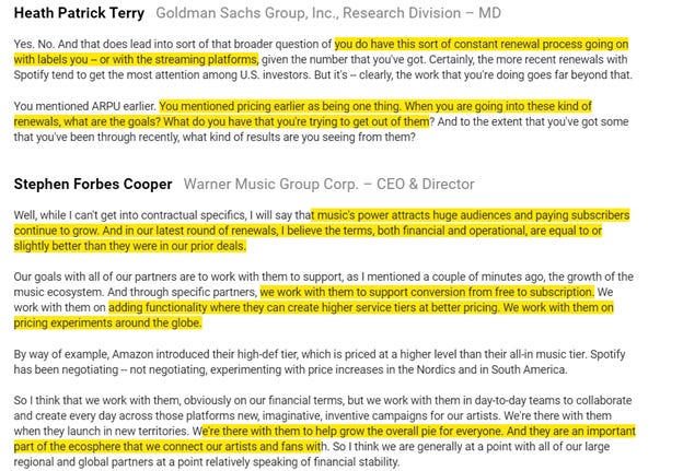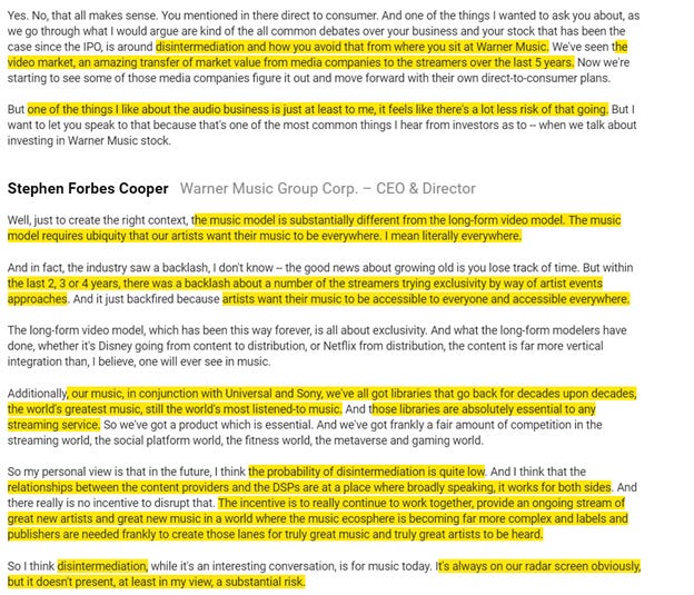 Anyway, while I’m planning that post for early next week (likely Monday), I’ve spent a lot of time researching the music industry this week. I’ve been saving a bunch of highlights / clips from that (mainly clips from expert calls, earnings calls, and WMG’s conference appearances), and I wanted a place to put them all so I could easily link to them in the upcoming post without turning the post into a fifty page long behemoth that is just overwhelmed by screenshots. Instead, this post will be overloaded with screenshots!
