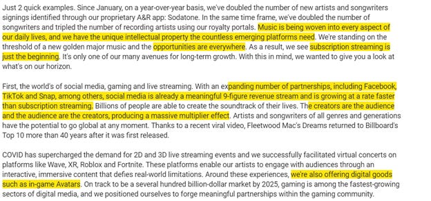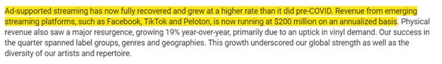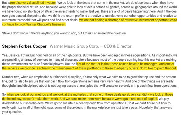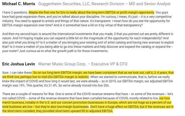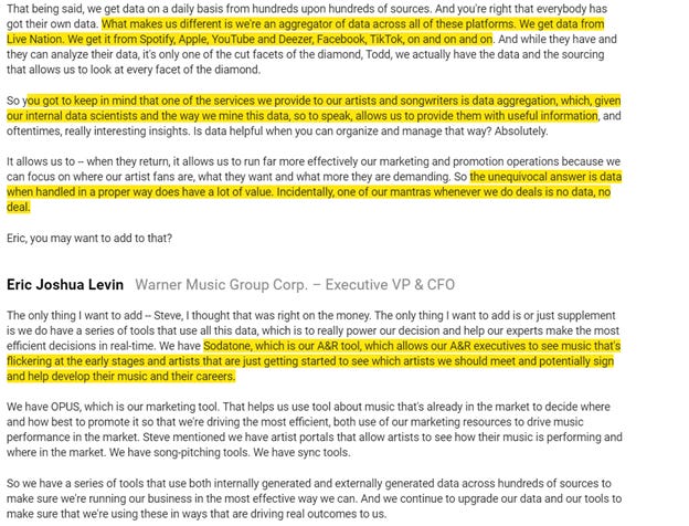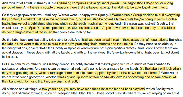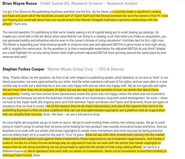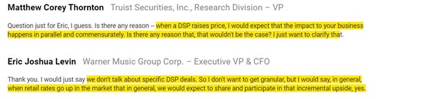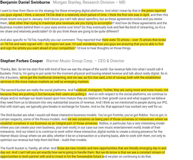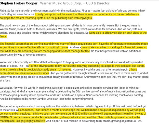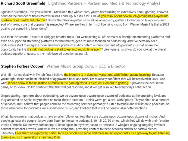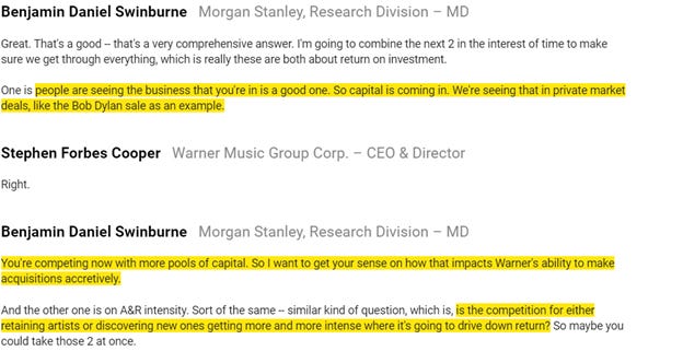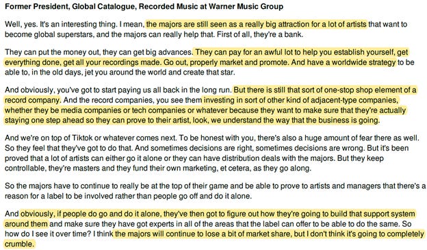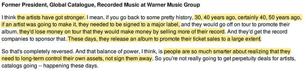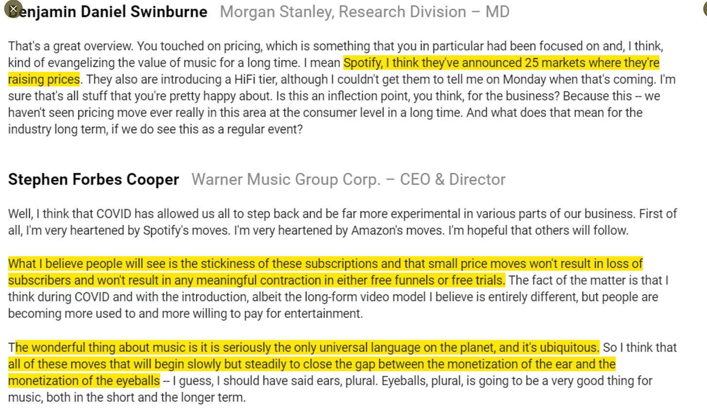 Anyway, while I’m planning that post for early next week (likely Monday), I’ve spent a lot of time researching the music industry this week. I’ve been saving a bunch of highlights / clips from that (mainly clips from expert calls, earnings calls, and WMG’s conference appearances), and I wanted a place to put them all so I could easily link to them in the upcoming post without turning the post into a fifty page long behemoth that is just overwhelmed by screenshots. Instead, this post will be overloaded with screenshots!