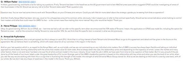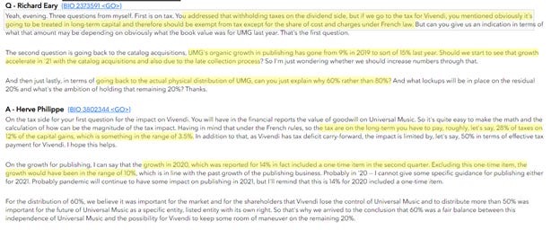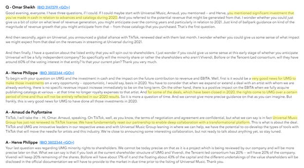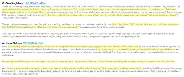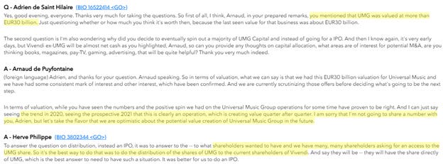 Before I get to the clips, I just want to highlight one thing: in my last post on UMG, I said I thought people would get excited about UMG once it was a standalone company and Ackman presented his full thesis on it. Nothing I’ve seen reading up on the industry has changed that view; Ackman / PSTH are buying into UMG at a low 20x EBITDA multiple; given the moat, visibility, and growth that UMG has, I think that ~20x multiple will prove much too cheap. I would say a multiple in the high 20s to low 30s would be more appropriate, but my work on the industry is still a work in progress I won’t specifically commit to any multiple yet. Still, I wouldn’t be surprised to look back 10 years from now and say, “yup, turns out UMG’s growth prospects and moat were so good 30x was actually too cheap.”
