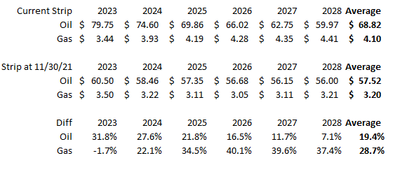 It’s as of November 2021; energy prices have obviously been just a bit volatile since then. I put together a quick strip comparison below; you can see oil prices for the next ~5 years are ~20% higher than at the time of their last PV-10, and gas is almost 30% higher. That should drive a nice uplift in PV-10!
