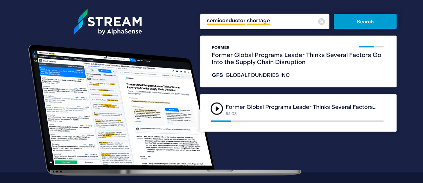 Say goodbye to traditional expert networks with Stream by AlphaSense. Stream enables you to access high-quality expert insights, in less time and at lower cost. With proprietary search technology and a library of more than 30,000 expert call transcripts, Stream provides the tools to help you make smarter decisions faster. Sign up today.