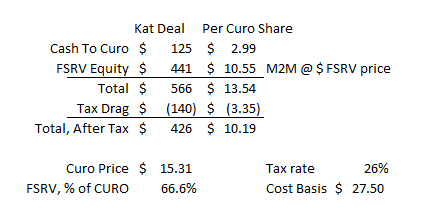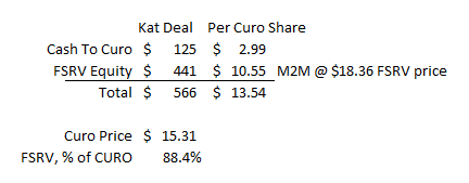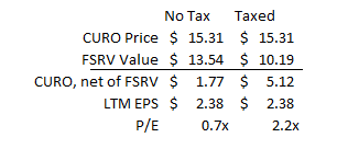 That’s an enormous number. CURO has ~42m shares outstanding; at their current price of ~$15.30, CURO’s market cap is ~$640m. CURO’s investment in FSRV represents ~90% of their market cap at these levels.
