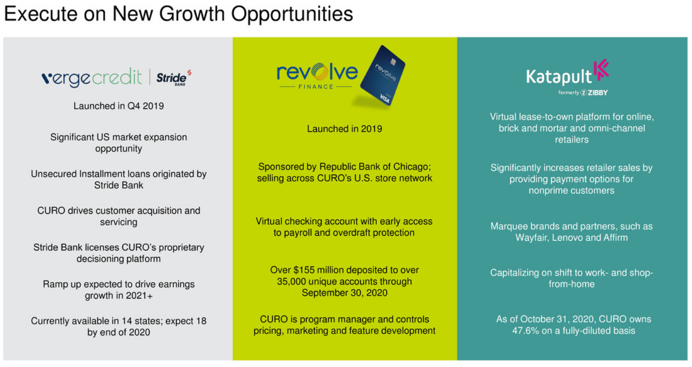 The third angle I’d point out is that CURO’s investment in Katapult was, obviously, a homerun; they started investing in 2017 and have turned a total of a $27.5m investment into a 20x in ~3 years. CURO was also clearly a believer in Katapult; they first invested in 2017 and they were increasing their position by investing into uprounds and even buying out other investors for the last several years. For example, in 2020, CURO invested another ~$11.1m to increase their stake in Catapult from 43.8% to 46.6% (at a ~$400m valuation versus a ~$1b value in the SPAC deal and >$2B valuation now once you adjust for the warrants). I highlight that because that level of conviction and success gives a management team some credence that the rest of their portfolio or any other growthy / VC investments they’re making might have a lot of upside. CURO does have two of those: Revolve Finance and Verge Credit (see image below from this investor pres). Obviously it’s unlikely either of those turn out to be a Katapult like homerun, but there’s no reason these couldn’t grow to be significant value opportunities. CURO’s November investor deck noted that revolve peers are getting valued at $500-$1,000/account. With 35k accounts, Revolve would be worth almost $20m at the low end of that range…. and that valuation could prove conservative, as money is cheap currently and Revolve is growing really quickly (their September investor deck (slide 24) noted Revolve had 33k accounts at July 2020; at that pace, it’s not crazy to think they’re at >40k accounts the next time they report). Interestingly, I listened to their CEO at the William Blair conference in June; several times through the conference, he went through all of the company’s growth opportunities and he actually seemed equally excited about the Verge/Stride opportunity as he was Katapult. Take that FWIW; I could be misinterpreting or imaging it, but I think it’s interesting and it’s a free-ish growth opportunity (also interesting, none of their conference appearances have transcripts on any of the major services as far as I’m aware of, so you need to listen to the actual audio to hear what they’re saying / thinking. Perhaps a mini-edge there?)