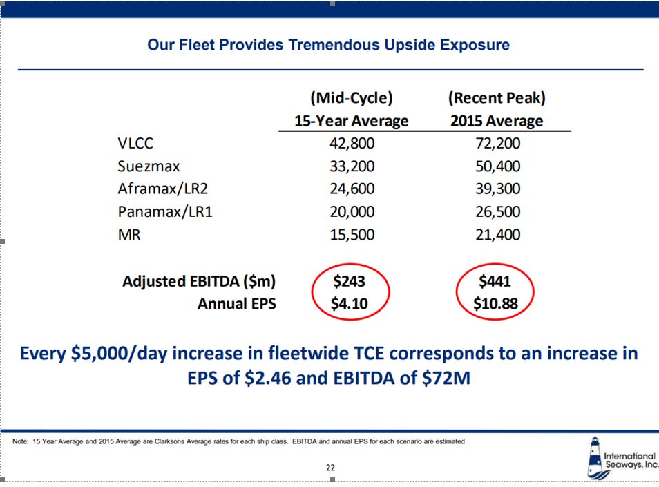 Ignoring that rates are likely significantly higher than the slide above currently (which is a lot to ignore!), the tankers absolutely mint money at those levels. INSW provided the slide below that shows them making $441m annual EBITDA at “2015 peak rates”; those rates are a bit above what they averaged in Q1’20 but appear substantially below current tanker rates.