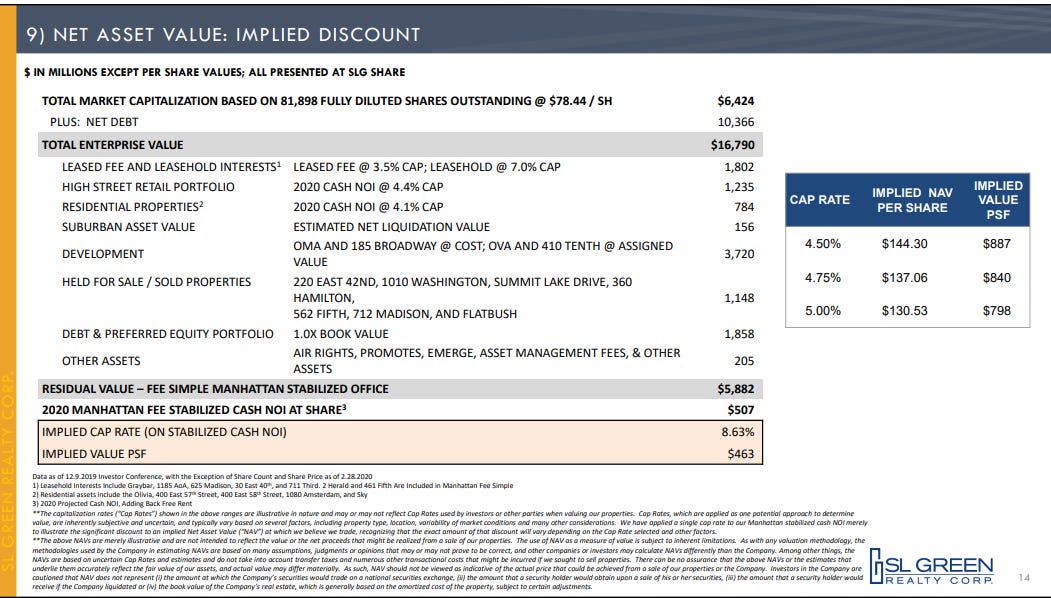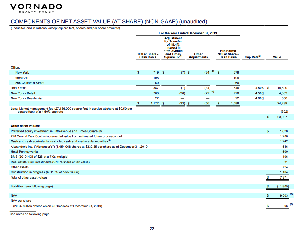 PS- I focused on SLG here, but VNO or any other loose peers are a similar story (based on SLG’s deck above, I would 37.5% of NAC and a 13% cap rate on their office buildings if you assume the rest of their marks are accurate. A similar assumption on VNO’s NAV puts them at 45% of NAV and a 10% cap rate). VNO’s shareholder letter is quite good and came out ~10 days ago, so it’s quite timely and worth a read. (VNO NAV assumption below)