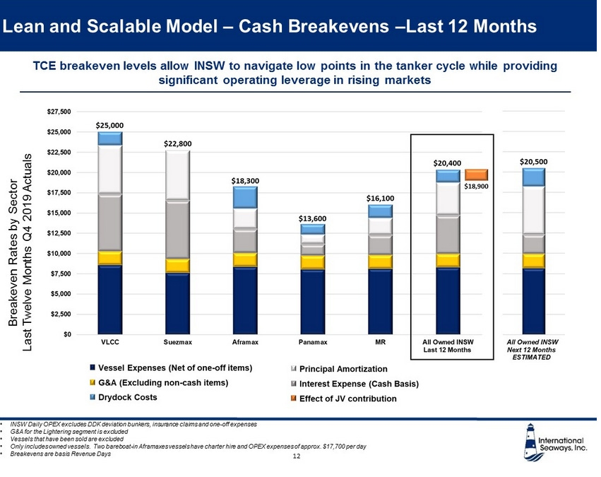 INSW’s entire EV is ~$1.35B, so at the rates / earnings profile presented above the whole company is trading for <4x EBITDA. Given a decent bit of leverage, the cash flow to equity is even more attractive. INSW actually gives their breakeven costs by vehicles, so you can plug in your own rate estimates and figure you how much cash flows through to the equity.