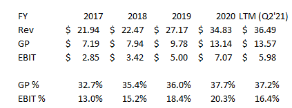 In the LTM, PDEX has done ~$36m in sales. Margins have taken a slight step back in the LTM (mainly due to a big increase in R&D), but over time you can see PDEX has been getting operating leverage on both the gross margin and EBIT lines.