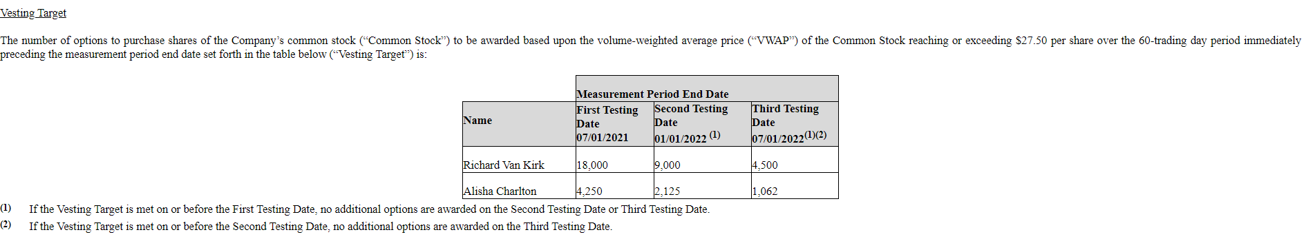 Now comes the interesting part. On February 23, the company responds to the drop by giving the execs a new stock option plan (“the third grant”) with some very interesting targets. The third grant has one vesting target: a $27.50/share price with a first test date of July 1, 2021 (just over four months after the grant date).