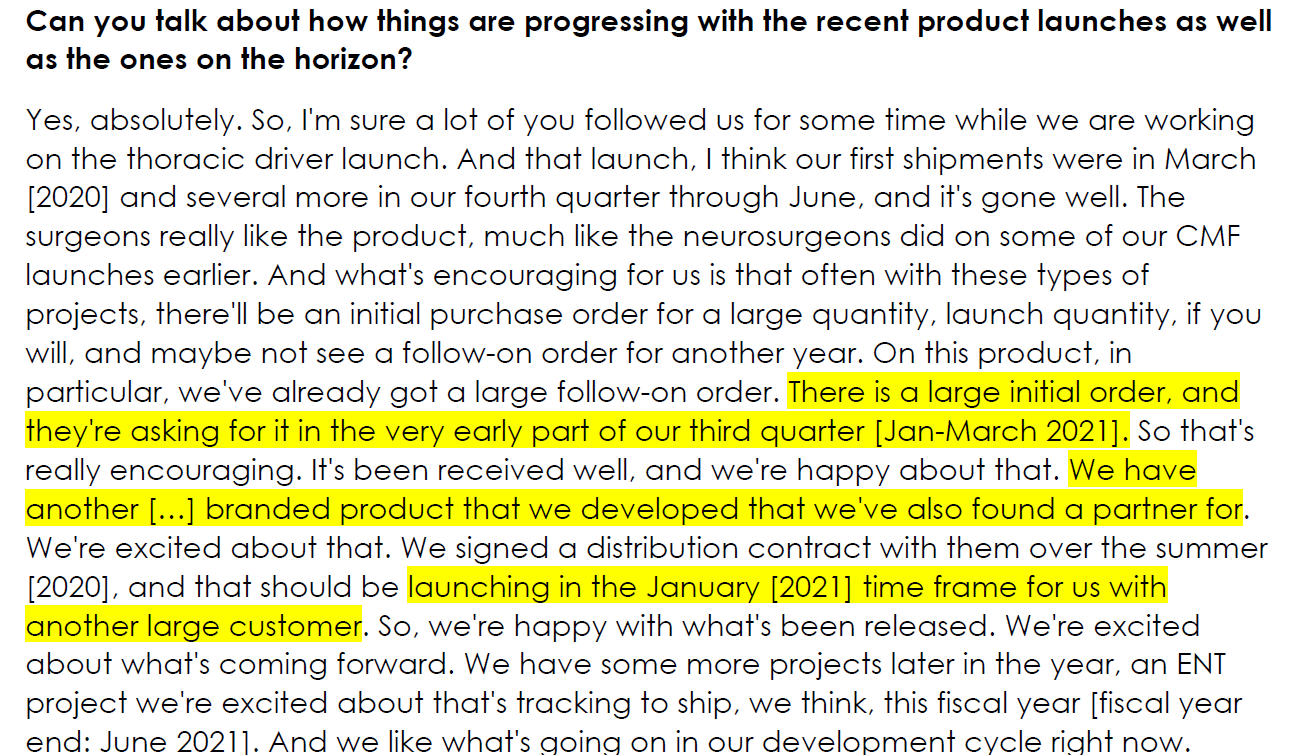 Now that’s really interesting. That’s the company discussing two different potential large launches that will happen within their Fiscal Q3’21 (January-March 2021; the quarter we’re currently in). Again, that quote seems to neatly fit the narrative that the company is seeing great results in the current quarter, and that their growth has taken another leg up, and they gave themselves the third grant because they got a little greedy looking at the discrepancy between share price and value.