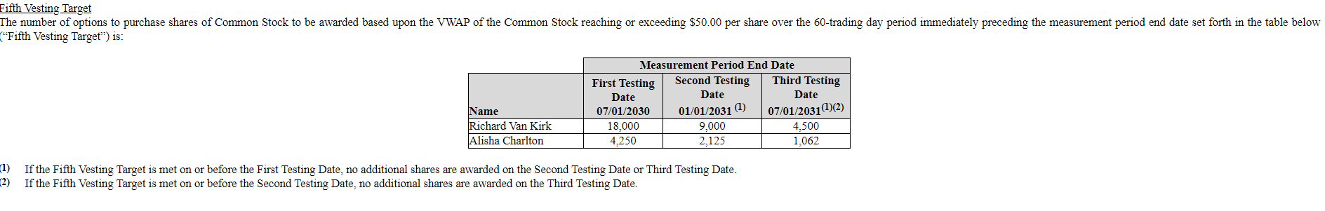 So let’s fast forward to December 2020. The stock is at $40/share (an incredible 80% IRR from the $7/price at the time of the 2017 grant), and the CEO and CFO have achieved all of their stock targets from the 2017 grant. Naturally, the company decides to award them another similar grant package in December (what I’ll call “the second grant”), though this time the package is a little different. Instead of giving the execs stock that vests at certain levels, the company gives the execs options that vest when they hit certain share prices. For example, the fifth target (see below) vests if the VWAP of the stock is $50/share over the 60 days preceding 07/01/2030. With the stock at $40/share when these were granted, that’s not a lot of price movement for those options to vest. If the stock merely compounds at ~2%/year, these options would vest, though they wouldn’t be worth much.